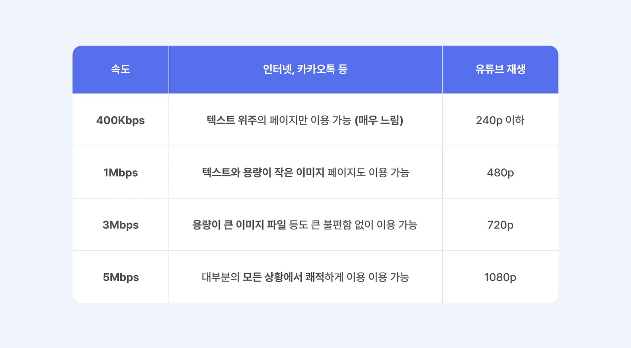 보통 3Mbps 정도의 속도라면 평소 사용하는 인터넷 서핑, 유튜브를 보는 것도 문제없어요. 5Mbps의 속도는 그보다 더 빠른 속도로 이용할 수 있고 이러한 표기가 있는 요금제라면 기본 제공 데이터를 다 쓰더라도 과금 없이 휴대폰을 이용할 수 있어요.