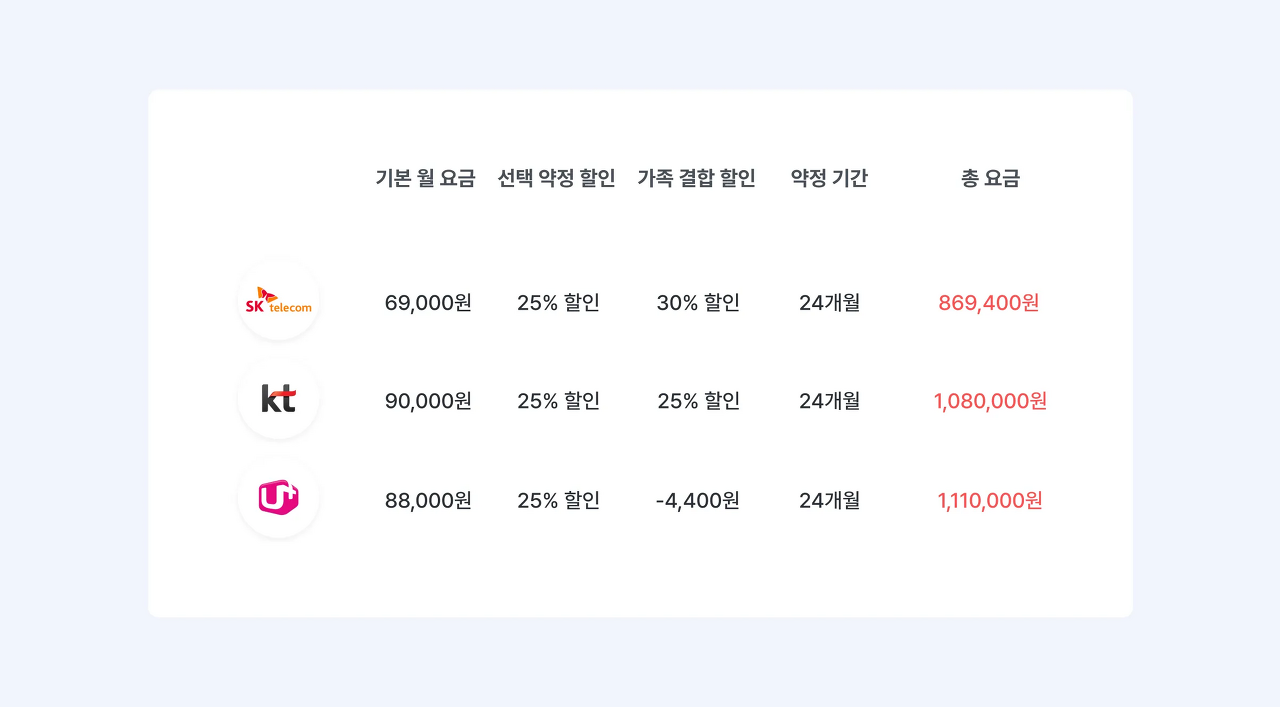 각 통신사 가족결합 할인 요금 비교표