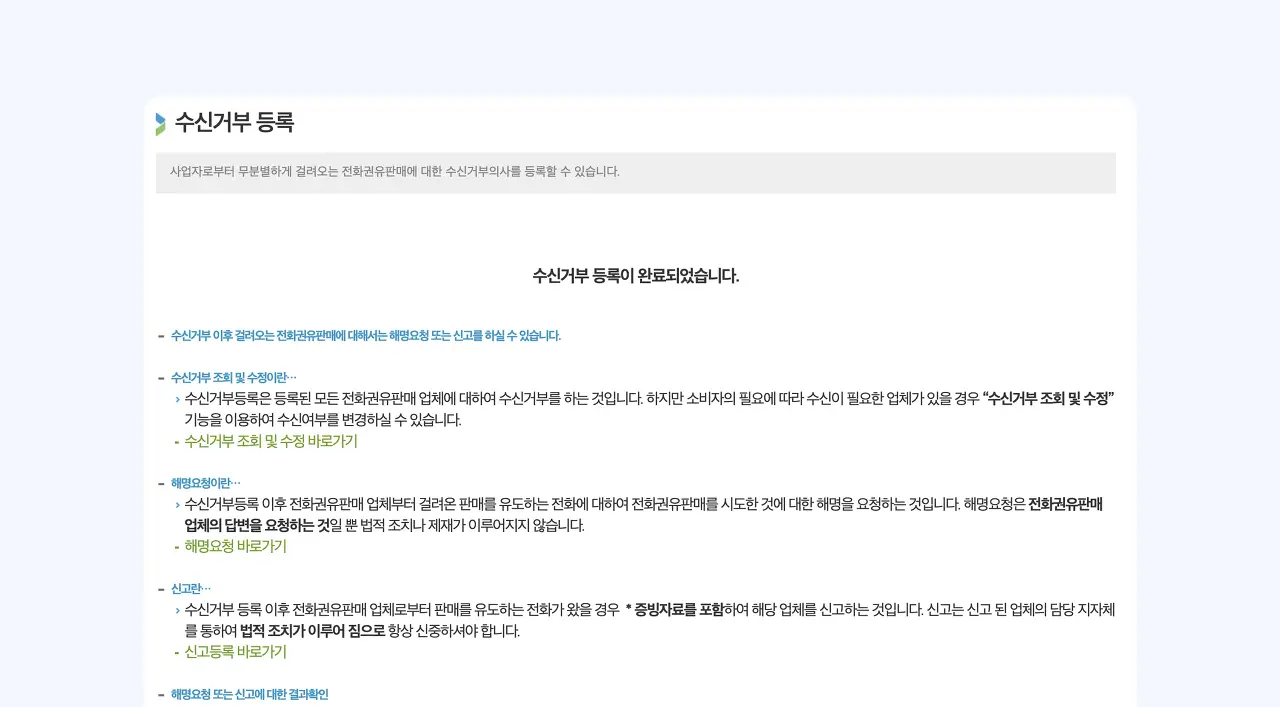 인증 번호를 입력해서 등록하면 수신거부 등록이 완료돼요.