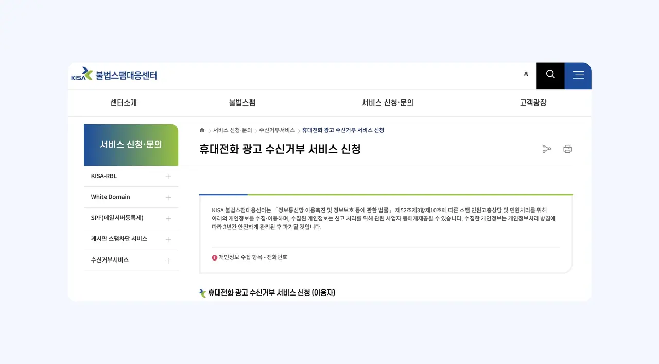 한국인터넷진흥원인 KISA에서 운영하고 불법 스팸 대응 센터에서 개인 사업가가 광고를 발송하기 전에 불법 스팸 대응 센터에 등록된 번호는 광고에서 제외할 수 있도록 지원하는 서비스예요.