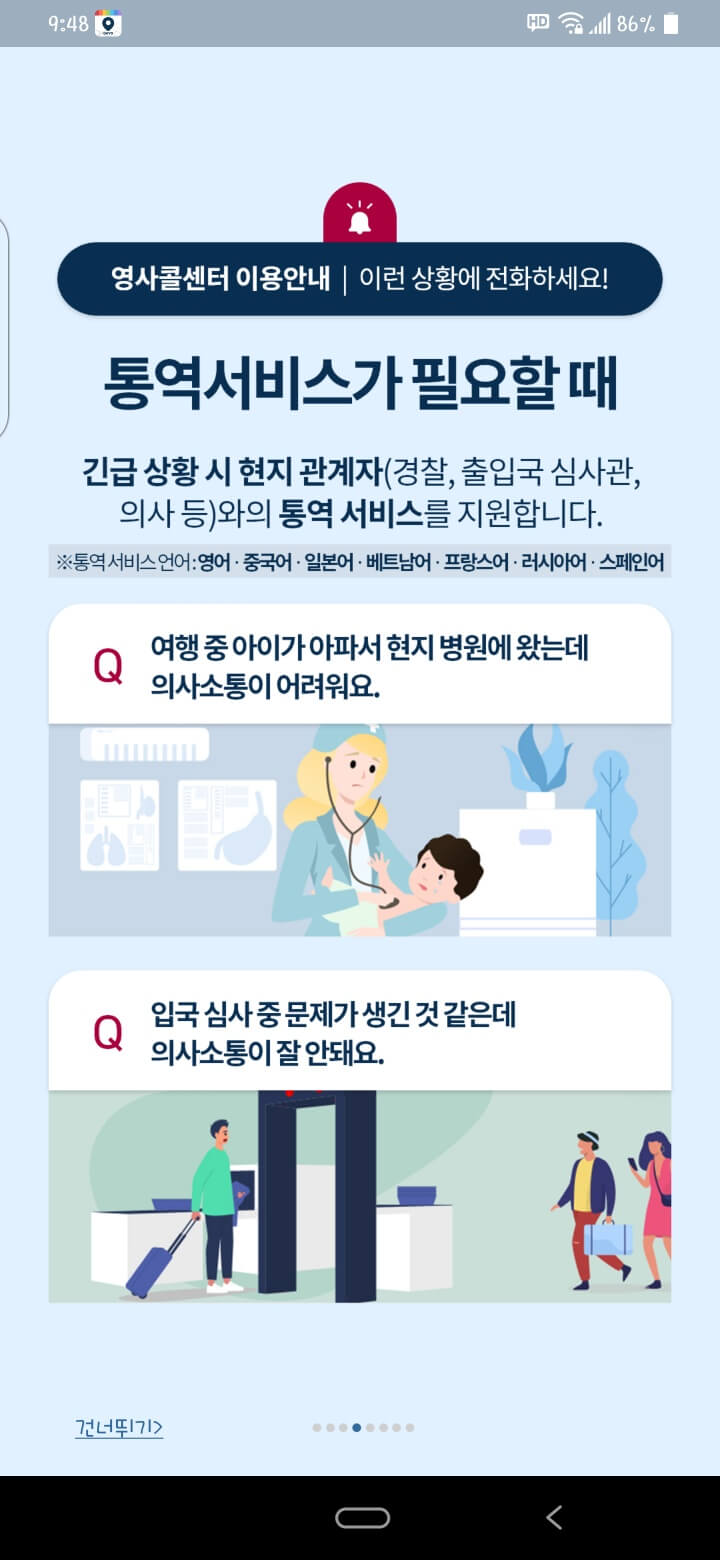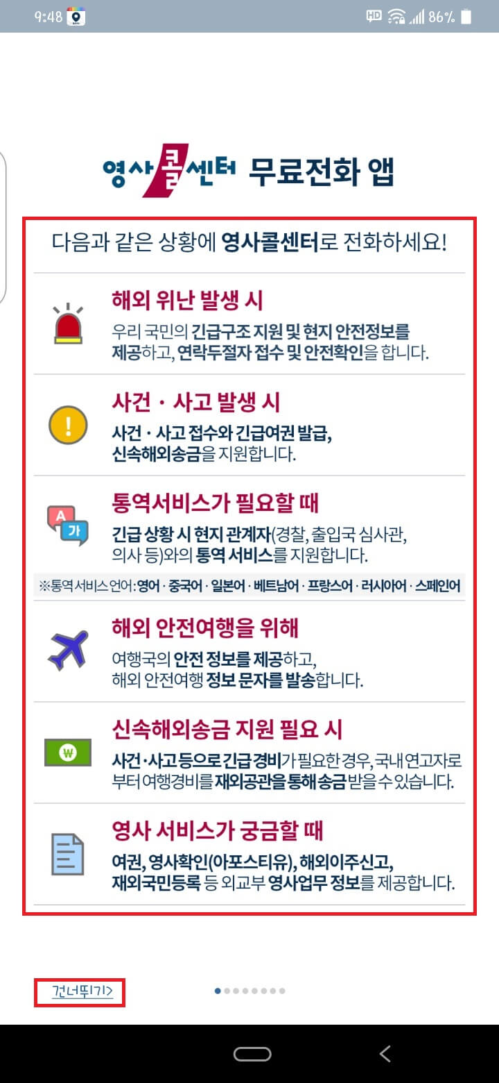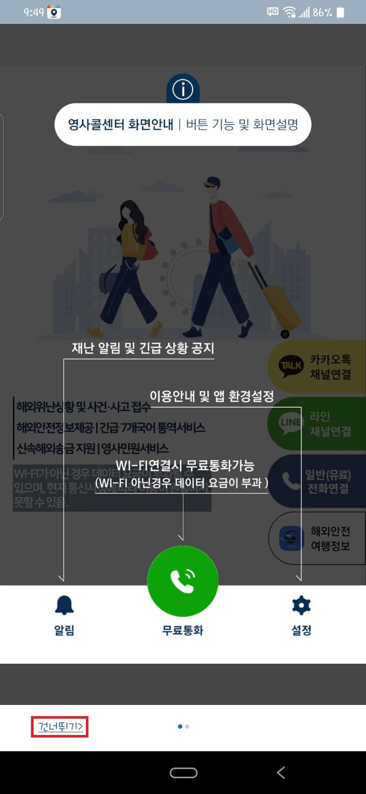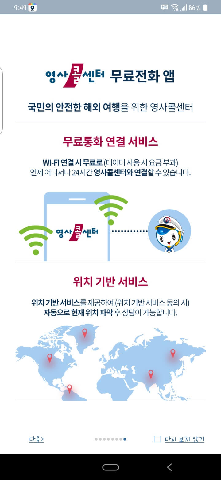 이 앱에서 24시간 언제든지 어디서나 여러분이 지갑이나 여권을 잃어버렸을 때나 혹은 통역 서비스가 필요할 때 직접 통화해서 도움을 주며 또한 위치 기반 서비스에 동의하면 문제가 발생한 자신의 위치를 영사 콜센터에 노출시킬 수 있습니다.