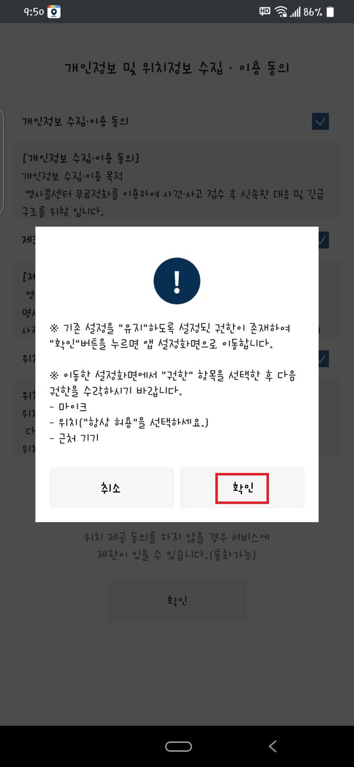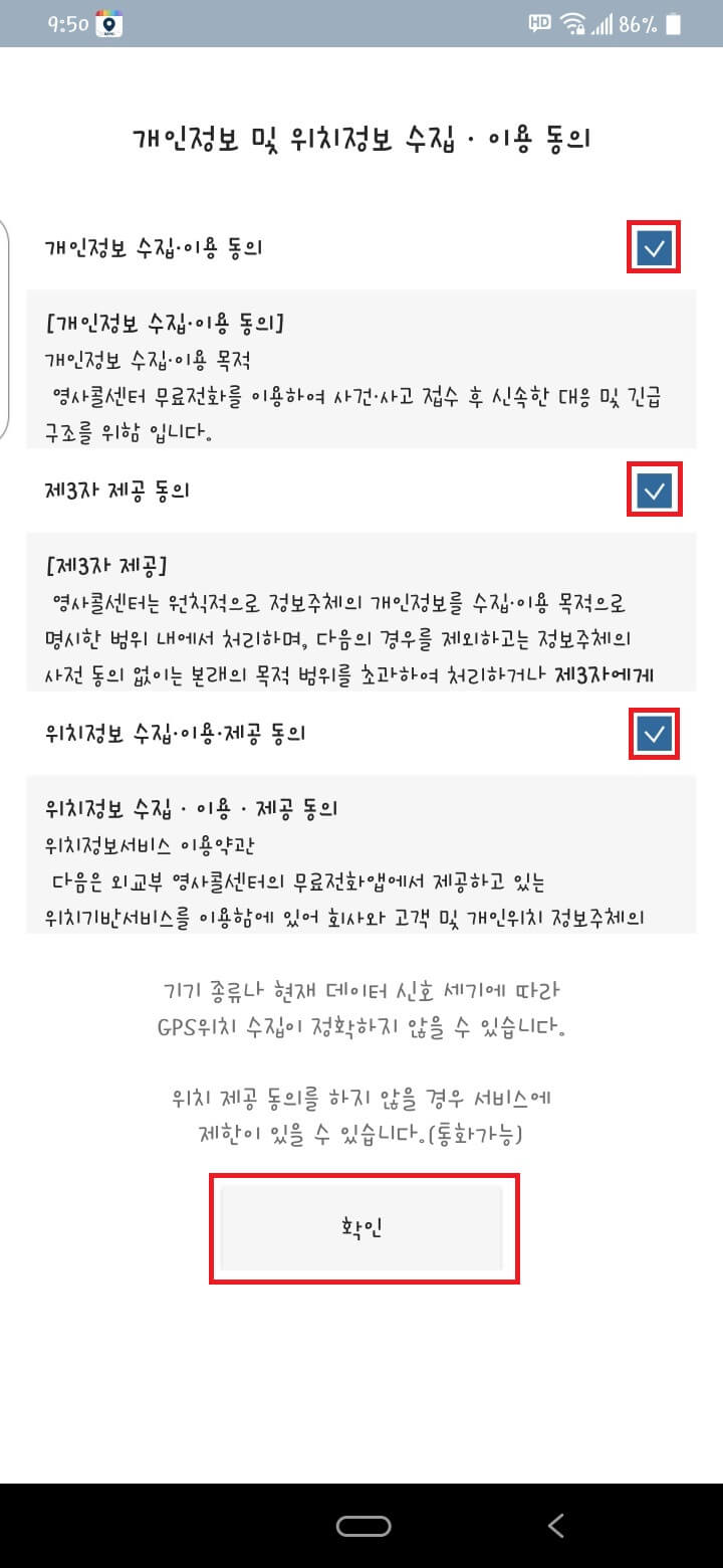 개인 정보 수집에 동의 버튼을 누른 후 확인을 누릅니다.