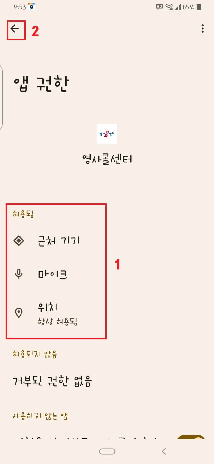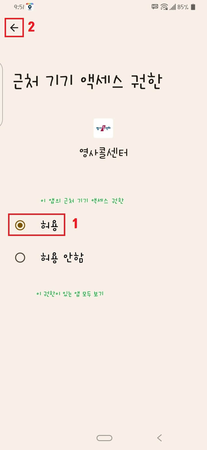 1번 허용을 누르고 2번 뒤로 가기를 누릅니다.