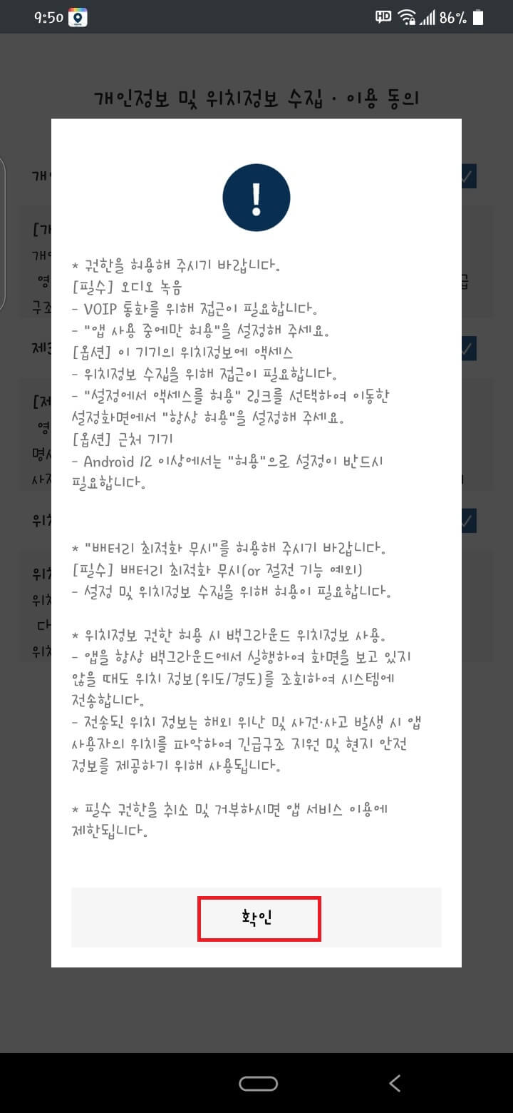 모든 설치가 완료되면 핸드폰 팝업 창에 외교부에서 위치정보를 수집 중이라는 창이 계속 뜨고 있을 겁니다.