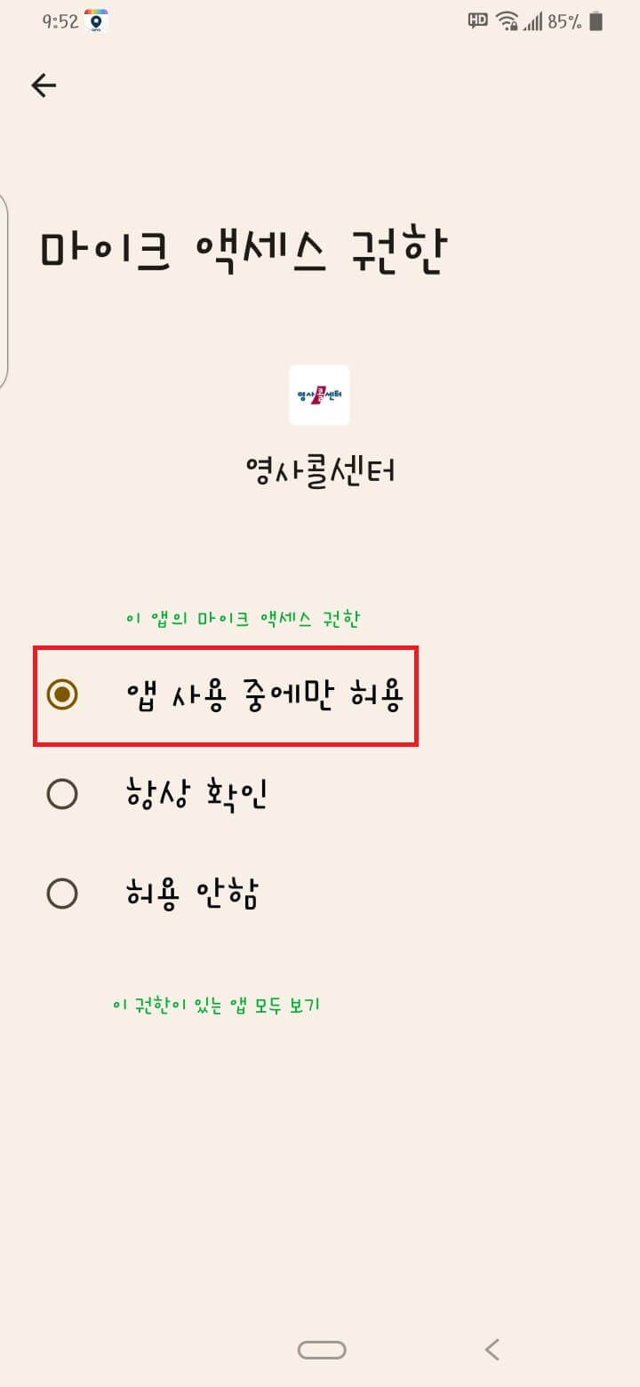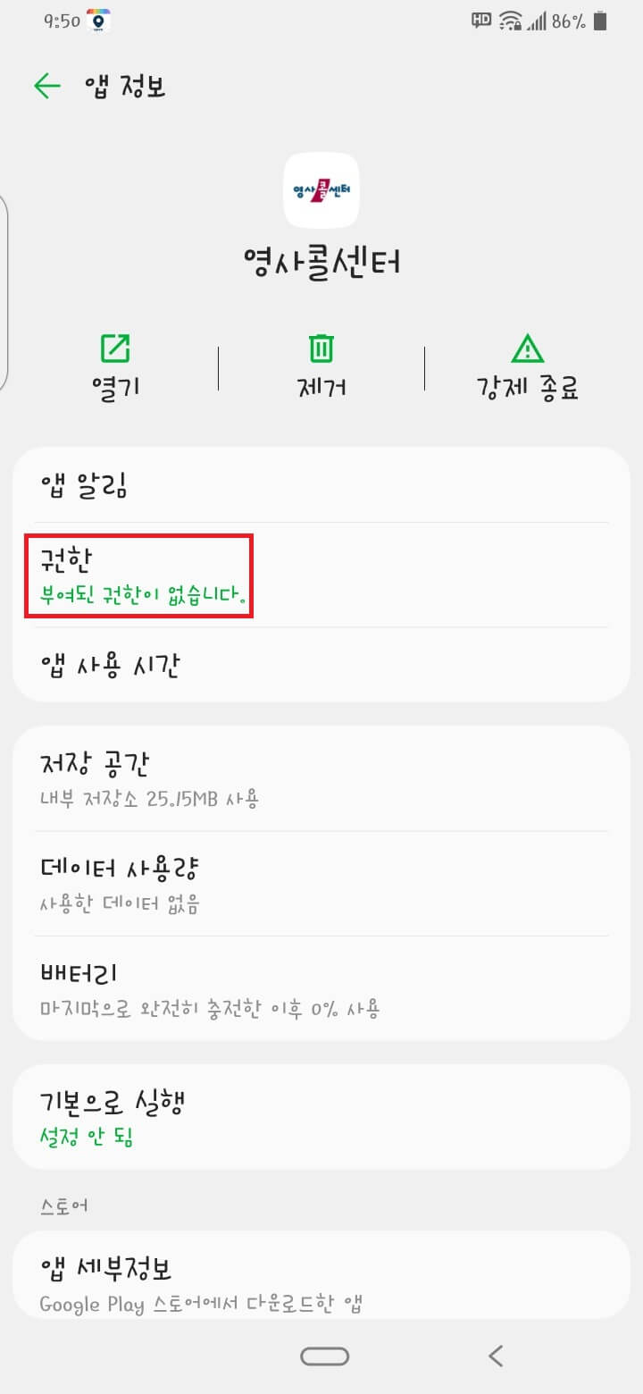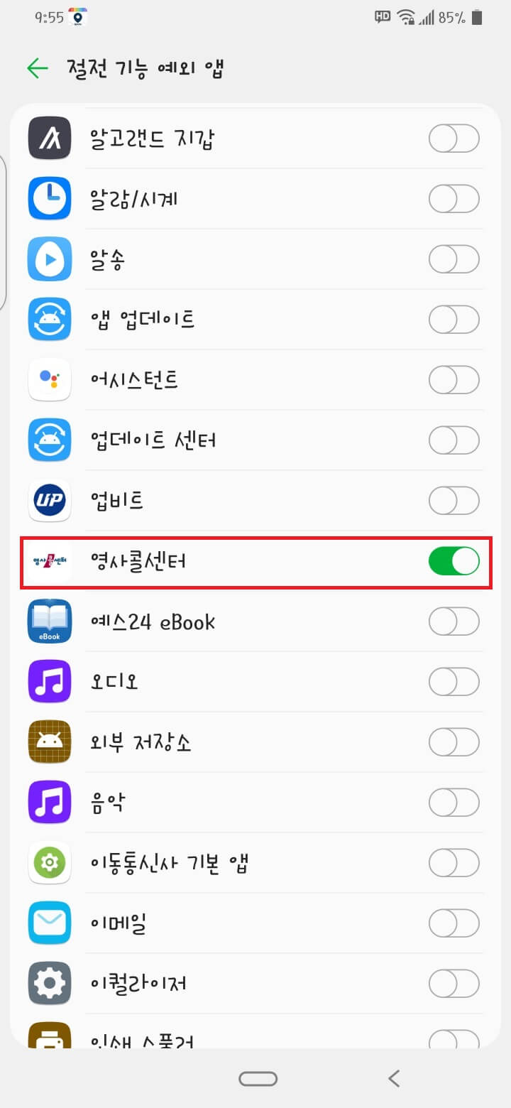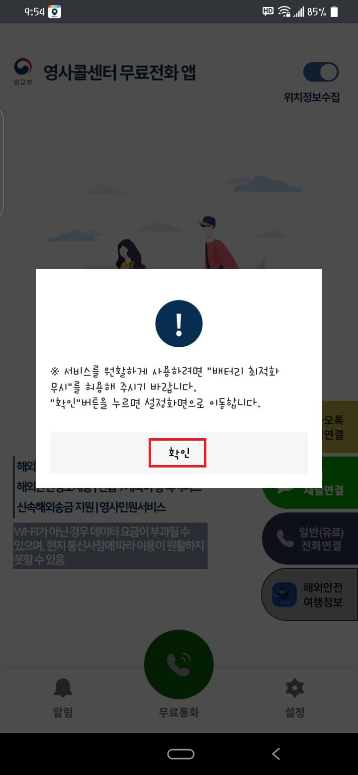 영사콜센터를 클릭하여 절전 기능 예외 앱으로 설정하시고 뒤로가기를 눌러 다시 영사콜센터 앱을 클릭하고 진행합니다.