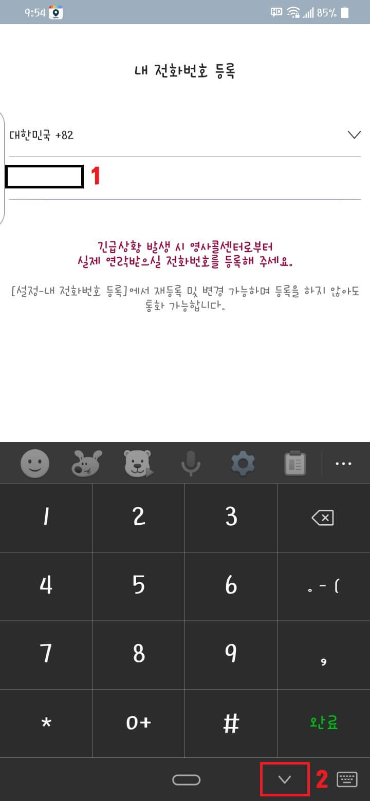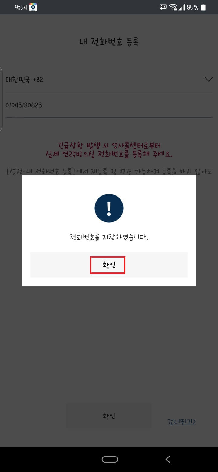 전화번호 등록하시고 화면 밑에 2번을 누르고 '확인'을 누릅니다.