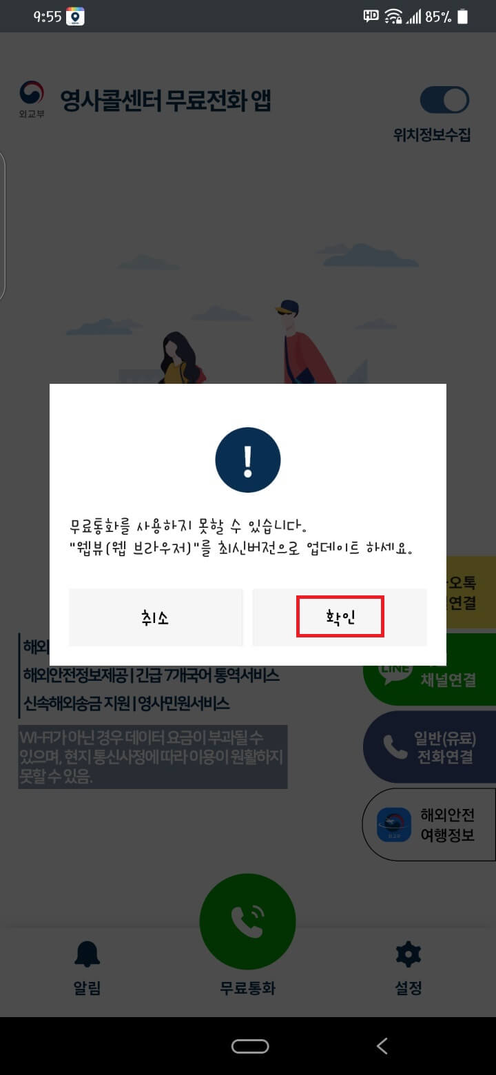 다시 영사콜센터 앱을 클릭하면 위와 같은 화면이 나올 수 있습니다. 확인을 누릅니다.