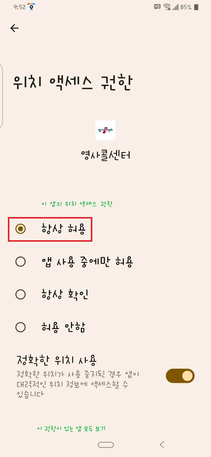 권한 설정이 필요합니다. 확인을 누릅니다.