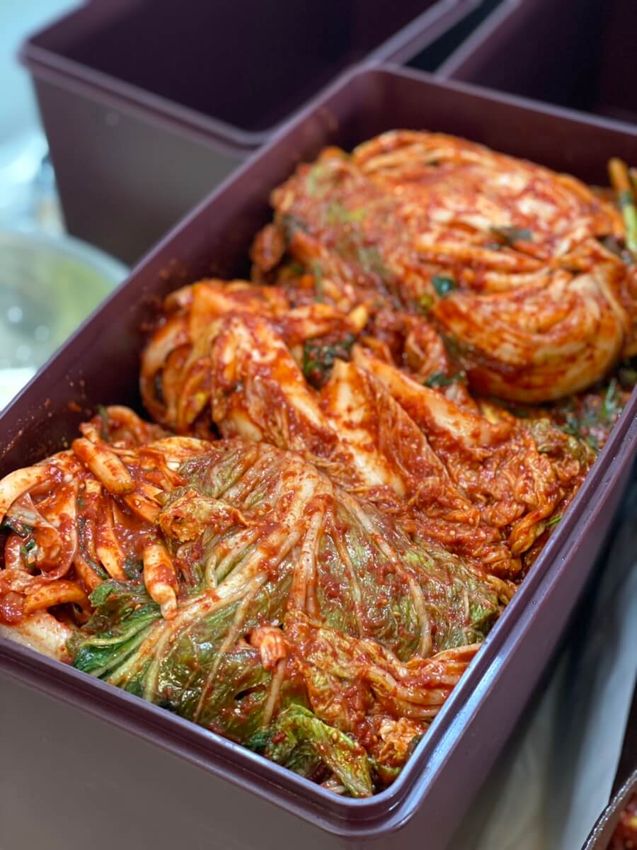 - 김치 싸기: 양념이 배추에 골고루 묻도록 싸주고, 약간 눌러 밀어주며 쌓아갑니다.