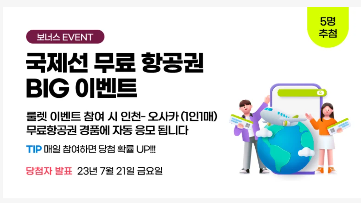 뿐만 아니라, 이번 프로모션에 참여한 고객들을 위해 사전 이벤트도 준비되었습니다. 룰렛 이벤트에 참여하신 분들 중 추첨을 통해 인천-오사카(1인 1매) 무료 항공권을 드립니다. 더불어 진마켓 기간에 사용 가능한 최대 5000원의 추가 할인 쿠폰도 랜덤으로 지급됩니다. 참여 기간은 20일까지이니, 망설이지 말고 지금 바로 응모해 보세요. 응모 횟수에 따라 당첨 확률도 높아집니다!