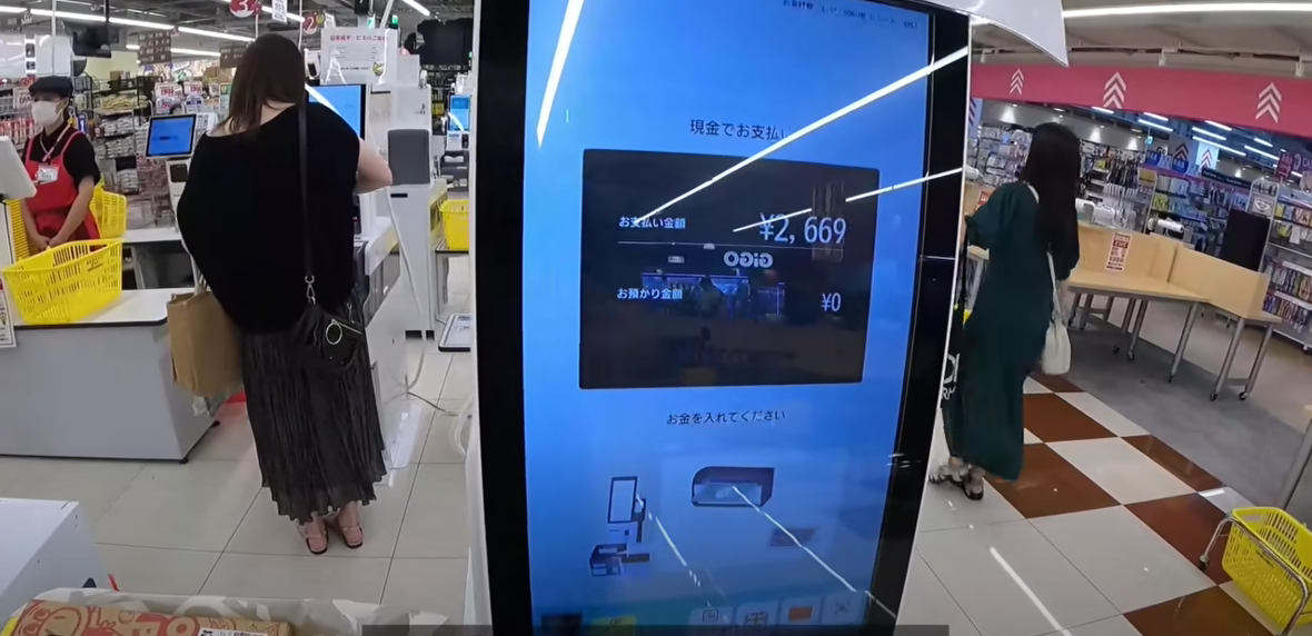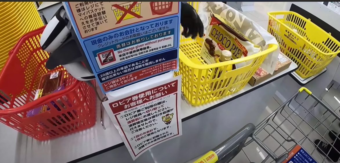 계산할 때는 계산대 옆에 봉지 한 장 구매하고, 직원이 계산해 주면 지불은 무인 계산기에 합니다.