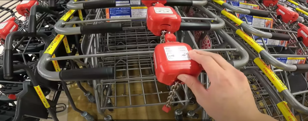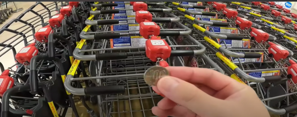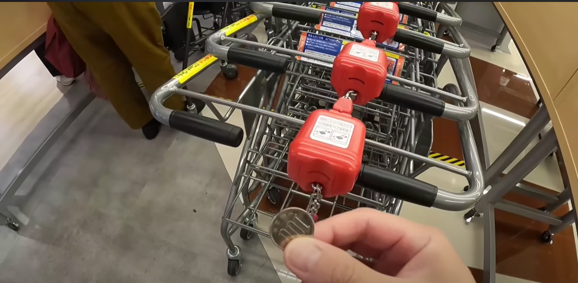 일본에서는 아주 희귀한 '코인식 쇼핑카트'가 있어요. 100엔 짜리 동전을 넣고 이용합니다.